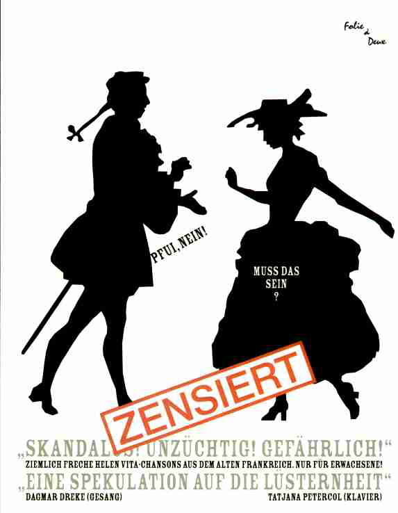 Folie à Deux, das unwiderstehliche Damenduo, serviert Ihnen humorvoll "musikalischen Schweinkram", der einst die Gerichte beschäftigte, der aber immerhin ahnen lässt, warum die Menschheit seit Adam und Eva nicht ausgestorben ist. Das Programm umfasst 20 musikalisch abwechslungsreich arrangierte Lieder, wird nicht nur gesungen sondern auch gespielt und ist verknüpft mit Moderationen, die sich mit den seltsamen Moralvorstellungen der 60er Jahre in Deutschland sowie mit dem Umgang von Sex und Erotik in den vergangenen Jahrhunderten beschäftigen.